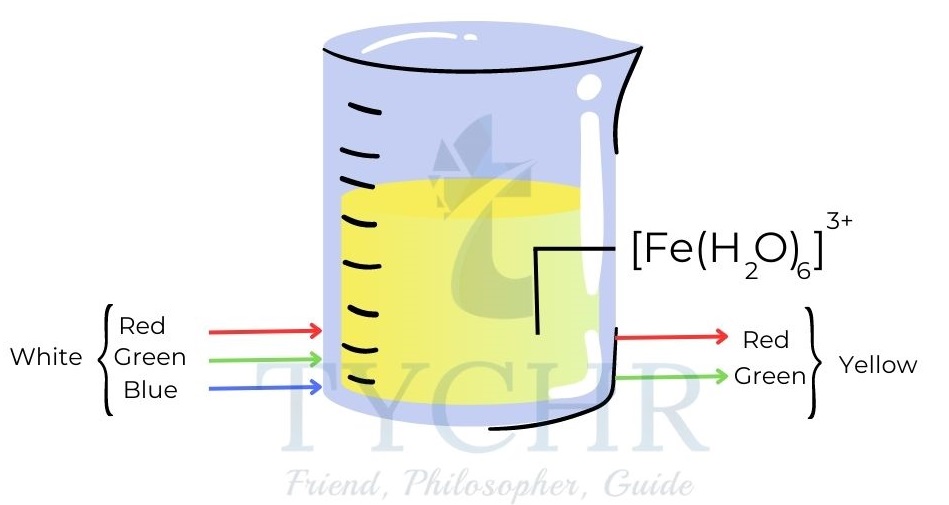 - [Fe (H2O)6]3+, for example, appears yellow because it absorbs light in the blue region of the spectrum.
