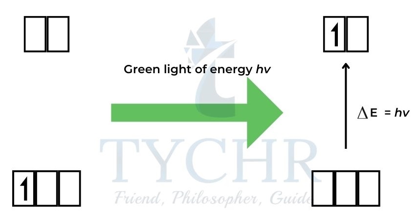 Figure 13: Green light of energy hν excites an electron from a d orbital of lower energy to a d orbital of higher energy. The transmitted light is purple.