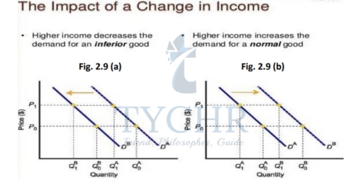 In fig 2.9 (a), with the change in the income of the consumer, the demand curve shifts from DA to DB. DB<DA. Similarly in fig 2.9 (b), with the change in income, the demand curve shifts from DA to DB. DB>DA.