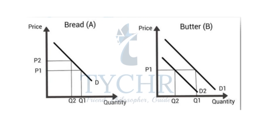 in the above fig, when the price of bread is increasing from P1 to P2, the demand for its