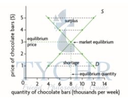In the above fig. market equilibrium is at 8000 bars where supply= demand. At a higher price say at 4$ Qty supplied(10,000 bars)> Qty demanded(6000 bars). There is an excess supply of 4000 bars. With unsold output of 4000 bars, the firm will reduce the price, thus resulting in decreased supply which will further start increasing the demand and reach the point where qty demanded=qty supplied.In case of excess demand, say for eg at price 1$, Qty demanded=12000 bars and qty supplied= 4000 bars. There is excess demand of (12000-4000) 8000 bars, as a result, price increase which inturn increases increases supply and the quantity demanded begins to fall and this happens till the point where qty supplied= qty demanded.