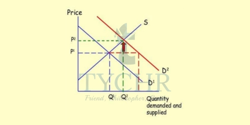 As demand increases, price also increases due to excess demand in the market from P1 to P2.As prices increases, supply will also increase from Q1 to Q2.