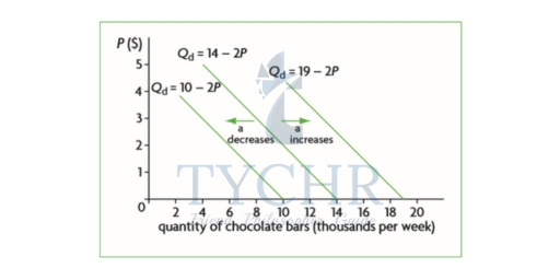 In the above fig. a new demand function is obtained i.e. Qd=10a-2P, due to change in the value of ‘a’ which may be due to a non price determinant which has shifted demand curve to the left. Similarly, in demand function Qd=19-2P, again due to change in non-price determinant, the demand curve has shifted to the right.