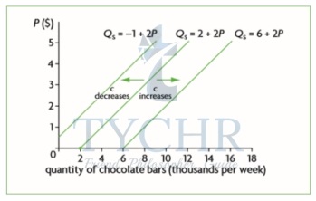 Parameter ‘c’ is a non price determinant of supply. A change in the value of ‘c’ causes a left handed or right handed shift of the supply curve, as seen in the figure above.