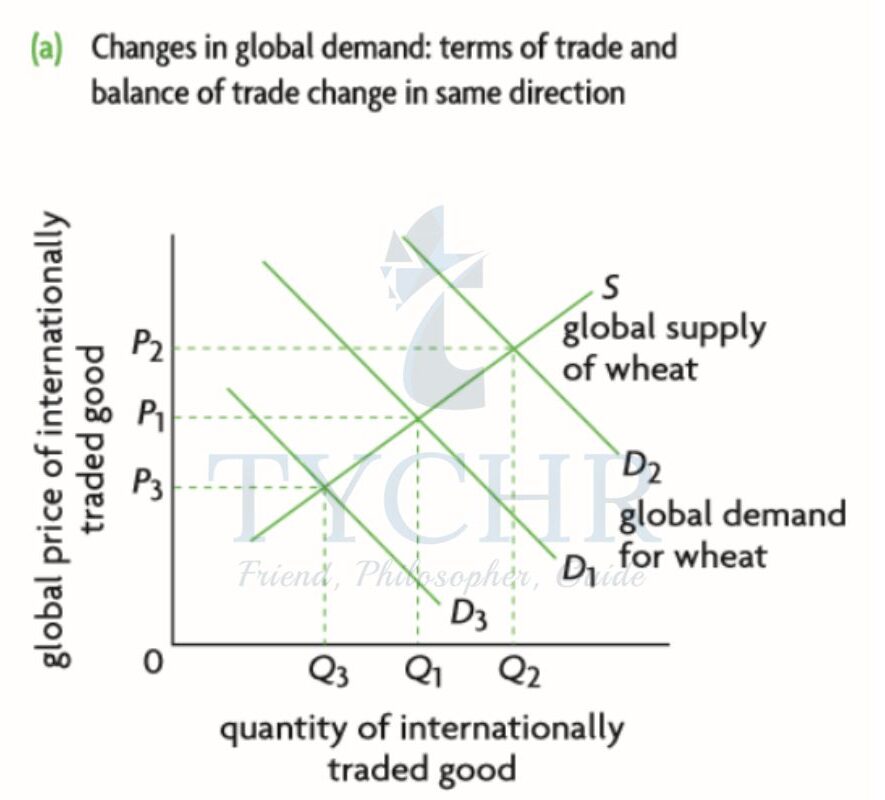 • The terms of trade and the balance of trade both shift in the same direction when a change in global demand for a good alters the terms of trade: