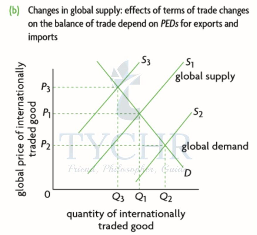 • When PEDx 1 or PEDM 1 (inelastic demand), the terms of trade and balance of trade move in the same direction (both improve or deteriorate) given a change in global supply that changes a country’s terms of trade.