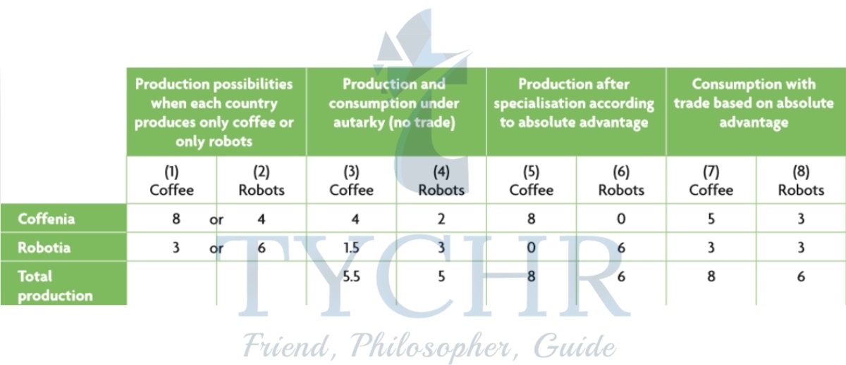 - From the above table, we can conclude by saying that Coffenia has an absolute advantage in coffee because it can produce 8 units of coffee compared to only 3 in Robotia. Similarly Robotia has an absolute advantage in robotics since it can produce 6 robots compared to only 4 in Coffenia.