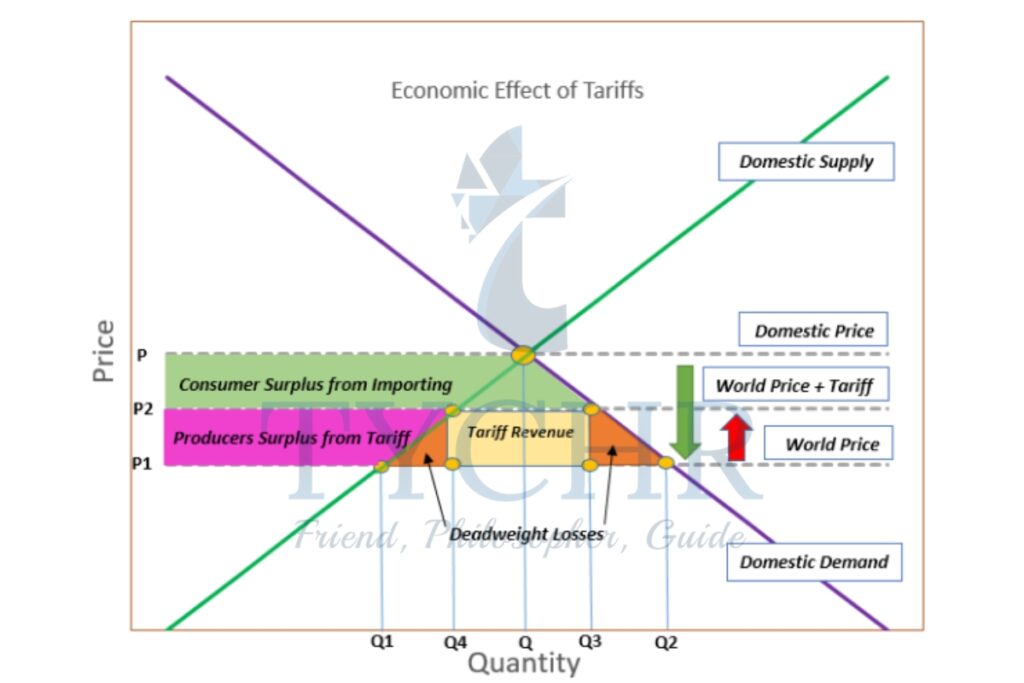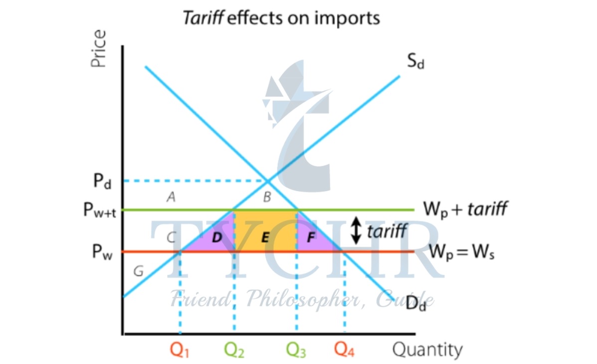 - Under free trade, the country will produce Q1, demand Q4, and import Q4 – Q1. The tariff will increase the price to Pw+t.