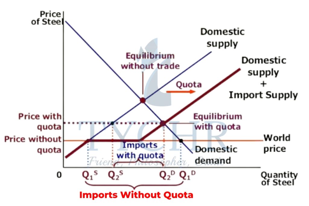 - Quotas – legal limit to quantity that can be imported over a time period. Similar effects as tariffs, but without gov’t revenue.