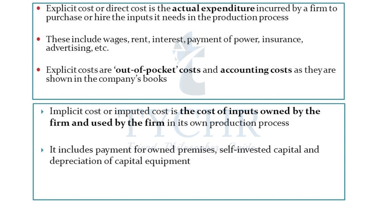 Economic Costs It is the sum of the explicit and implicit costs or total opportunity costs incurred by a firm for its use of resources, whether purchased or self owned. When economists refer to ‘costs’ they mean ‘economic costs’.