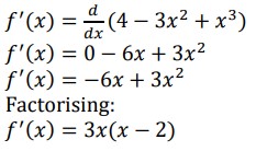 Ex. f(x)=4-3x2+x3  for -2≤x≤3. Find stationary points and their nature, intervals for which the function is increasing or decreasing, and identity the critical points as local or global extrema. For critical points f'(x)=0