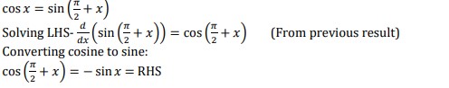 2. Cosine function 𝒅(𝐜𝐨𝐬 𝒙)/𝒅𝒙 = − 𝐬𝐢𝐧𝒙 This can also proved graphically just like the previous one. We will try to prove by our knowledge of trigonometry.
