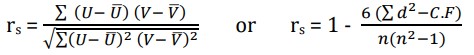 Spearman’s rank correlation coefficient is calculated from a sample of N data pairs (X, Y) by first creating a variable U as the ranks of X and a variable V as the ranks of Y (ties replaced with average ranks). Spearman’s correlation is then calculated from U and V using:Example: Find the Spearman’s rank correlation coefficient for the following data: